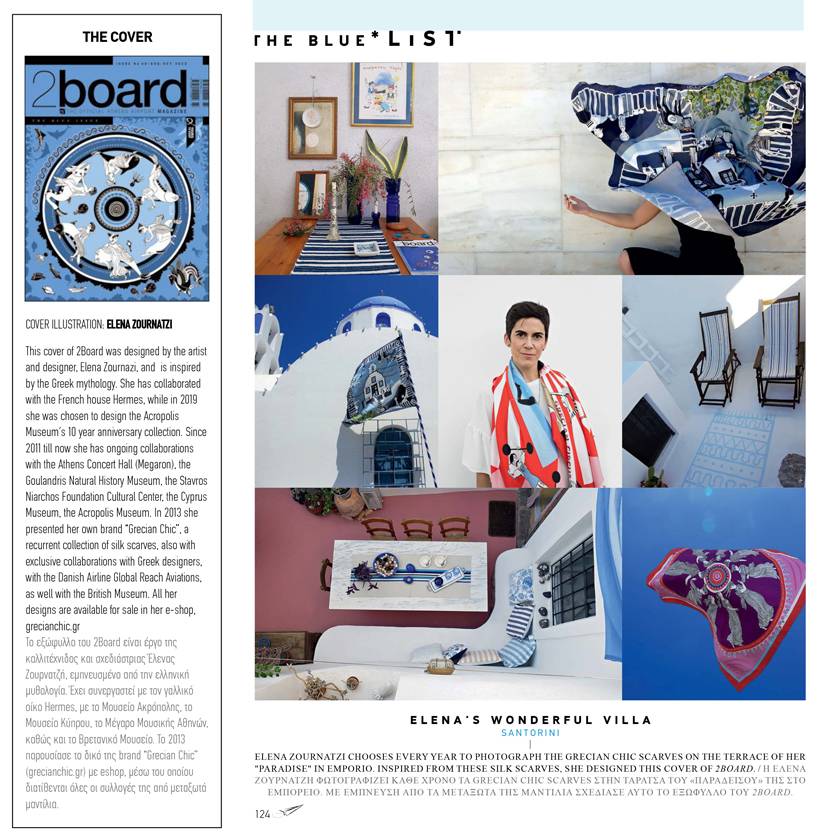 This cover of 2Board was designed by the artist and designer, Elena Zournazi, and is inspired by the Greek mythology. She has collaborated with the French house Hermes, while in 2019 she was chosen to design the Acropolis Museum ́s 10 year anniversary collection. Since 2011 till now she has ongoing collaborations with the Athens Concert Hall (Megaron), the Goulandris Natural History Museum, the Stavros Niarchos Foundation Cultural Center, the Cyprus Museum, the Acropolis Μuseum. In 2013 she presented her own brand “Grecian Chic”, a recurrent collection of silk scarves, also with exclusive collaborations with Greek designers, with the Danish Airline Global Reach Aviations, as well with the British Museum. All her designs are available for sale in her e-shop, grecianchic.gr
