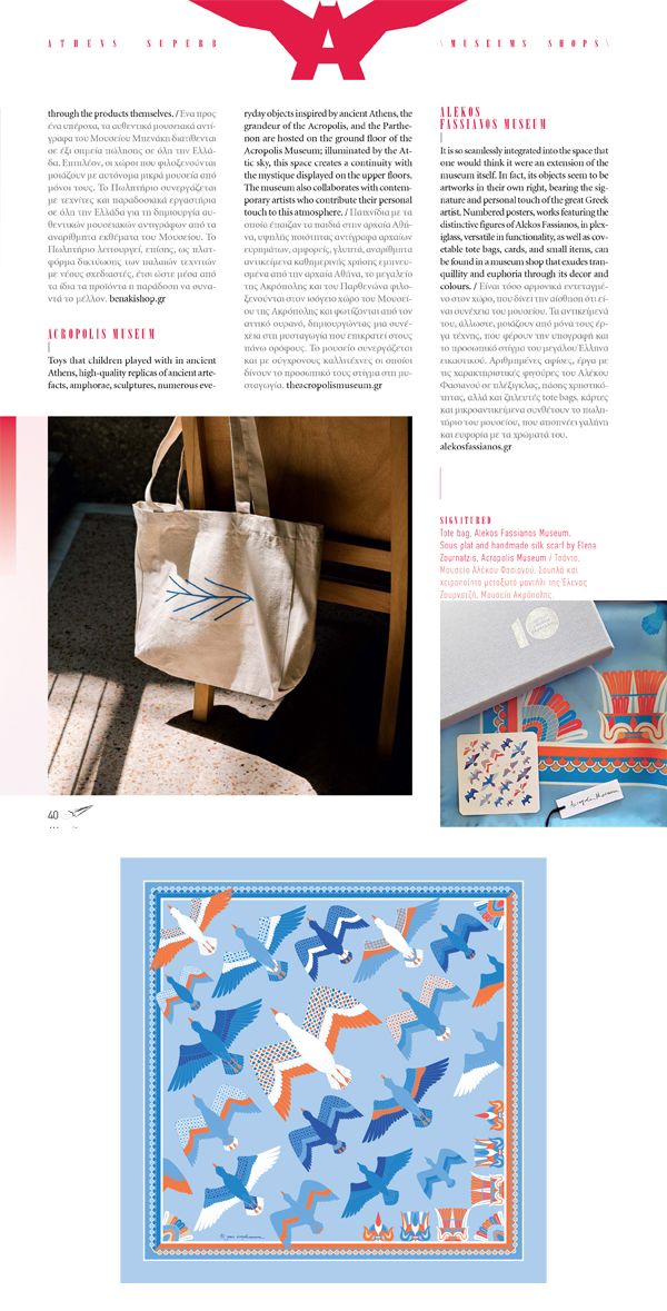 Toys that children played with in ancient Athens, high-quality replicas of ancient arte- facts, amphorae, sculptures, numerous everyday objects inspired by ancient Athens, the grandeur of the Acropolis, and the Parthe- non are hosted on the ground floor of the Acropolis Museum; illuminated by the At- tic sky, this space creates a continuity with the mystique displayed on the upper floors. The museum also collaborates with contem- porary artists who contribute their personal touch to this atmosphere. theacropolismuseum.gr