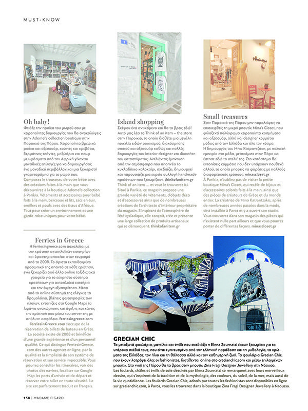 Τα μεταξωτά φουλάρια, μαντίλια και twills που σχεδιάζει η Elena Zournatzi έχουν ξεχωρίσει για τα υπέροχα σχέδιά τους που είναι εμπνευσμένα από την ελληνική παράδοση και τη μυθολογία, τα χρώματα της Ελλάδος, τον ήλιο και τη θάλασσα αλλά και την καθημερινή ζωή. Τα φουλάρια Grecian Chic, που έχουν λατρέψει όλες οι fashionistas, διατίθενται online στο grecianchic.com και μέσω επιλεγμένων μπουτίκ. Στο νησί της Πάρου θα τα βρεις στην μπουτίκ Zina Fragi Designer Jewellery στη Νάουσσα.